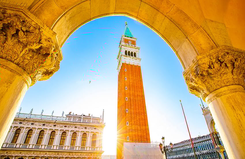 St. Mark’s Campanile, or the San Marco Campanile, is the tallest building in Venice at just under 325 feet. It was first built in the 9th century but has undergone a handful of rebuildings and restorations due to fires, collapses, and general wear and tear. We recommend purchasing tickets to climb the Campanile well in advance. And once you make it to the top, you’ll enjoy one of the most stunning, panoramic views of Venice.